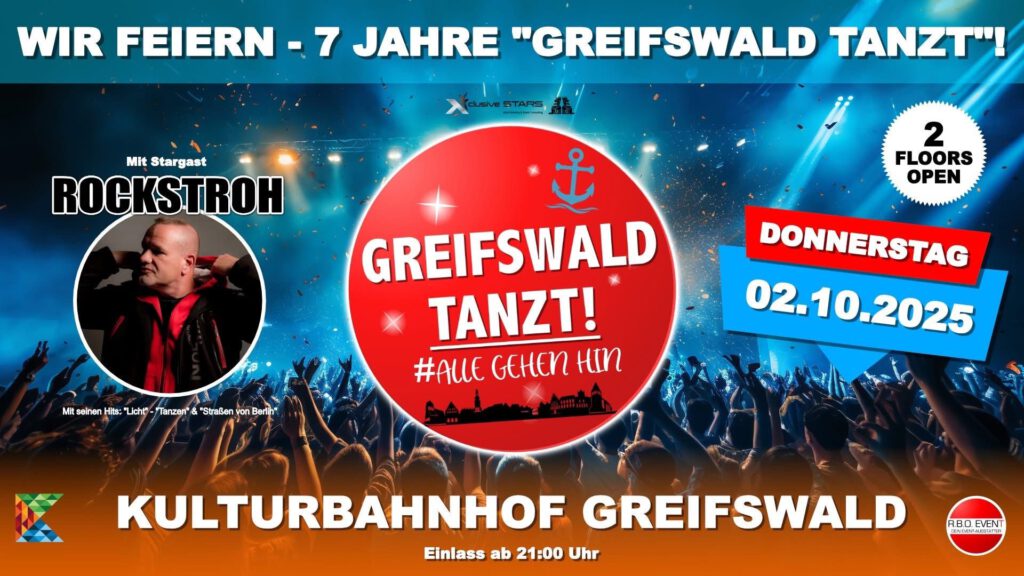 02.10. @ 21:00 – 23:45 – 🎉 7 Jahre GREIFSWALD TANZT! – Feiert mit uns! 🎉 Am 02.10.2025 (der Tag vor dem Feiertag) feiern wir ein ganz besonderes Jubiläum! 7 Jahre voller Rhythmus, Freude und unvergesslicher Tanzmomente im Kulturbahnhof Greifswald! 🕺💃 Kommt mit uns auf eine Reise durch die besten Beats und Tänze! Freut euch auf: ✨ Mit Stargast „ROCKSTROH“ Live […]